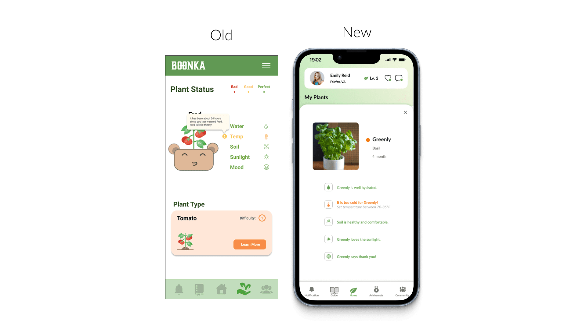 The Boonka home screen was redesigned to improve visual hierarchy and spacing. I also added a “Quick Tips” section so users can immediately understand what their plant needs.