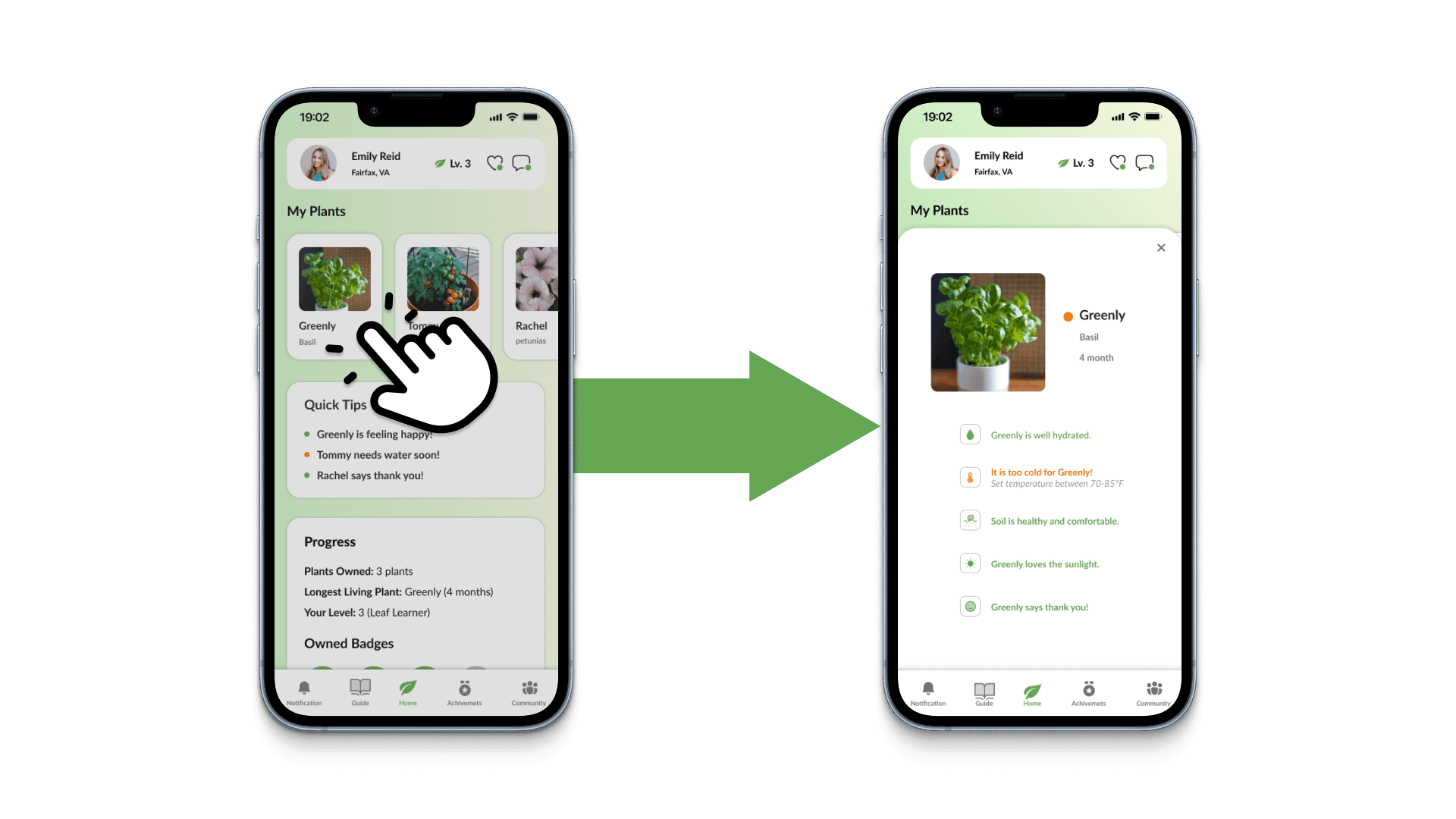 Instead of sending users to a separate page to view plant status, I redesigned the interaction so that a slide-up popup appears when a plant is selected. This creates a smoother, more efficient user flow.